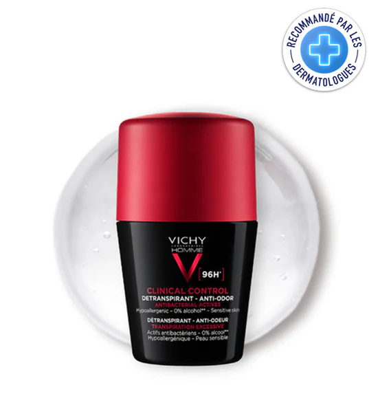 Le déodorant VICHY HOMME Clinical Control 96h associe une tenue extrême à une action anti-odeurs et anti-humidité grâce au zinc purifiant et à la perlite absorbante et matifiante.